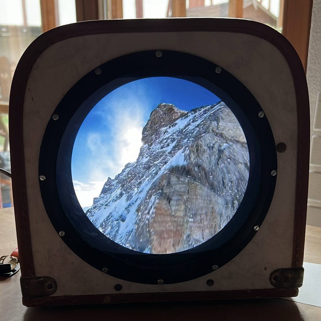 »Cyclops« ist eine Weltmaschine. Durch eine Art Bullauge (das aus einer Belichtungsanlage für Chipmasken stammt) entsteht ein unwirklicher 3D-Effekt. Stilecht eingebaut in einen Koffer, der vor vielen Jahren einen 8mm-Filmprojektor »Eumig P8 imperial« beheimatete.