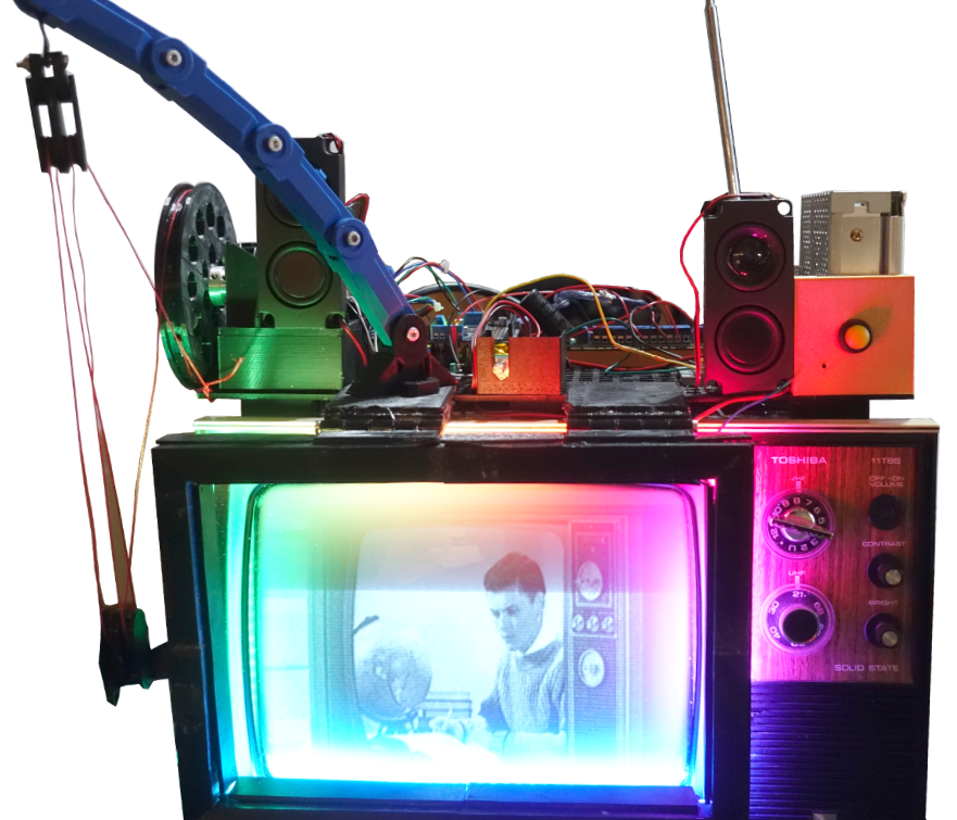 „NTSC“ treibt diesen zum Scheitern verurteilten Ansatz auf die Spitze, indem ein etwa dreieinhalb Minuten langes S/W-Video (lauter Musikstücke, die etwas mit Farben zu tun haben) „passend“ (wie gesagt, mit viel gutem Willen…) eingefärbt wird. Die martialische Robotik auf dem TV-Gerät dient zum Runter- und Hochklappen des Farbrahmens. Nicht notwendig, aber eine nette Fingerübung in 3D-Druck und Mikroprozessorsteuerung.